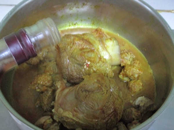 7.加入開水,水量能浸沒牛肉,大火燒開后加蓋轉小火燉約1個半小時