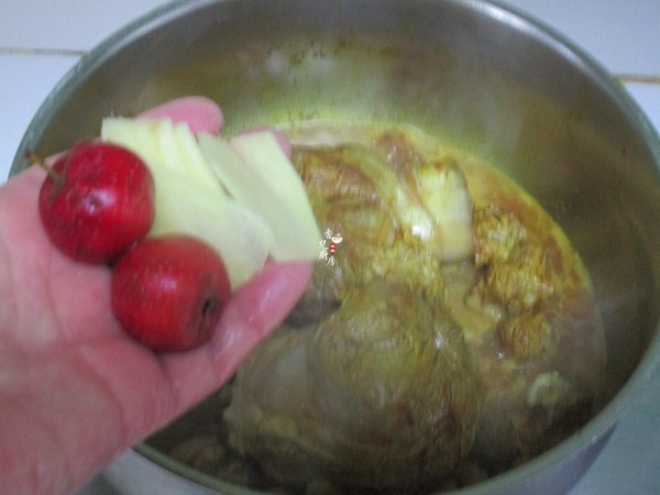 6.再把山楂和生姜片入鍋。沒有新鮮的山楂也可以用曬干的山楂片,不要多否則會有酸味
