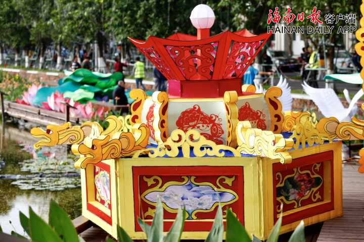 12月26日,記者在海口三角池公園看到,各色精美花燈在東湖畔有序擺放,工人在做造型拼接和通電施工。海南日報客戶端記者陳若龍 攝