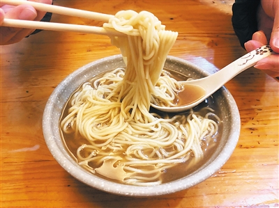 不一會兒,一碗熱乎乎的姜糖水面便從灶臺端上了桌。湯底黃中透亮,口感醇厚微辛,“呼嚕呼嚕”一碗下肚,從頭暖到腳,暢快出汗。