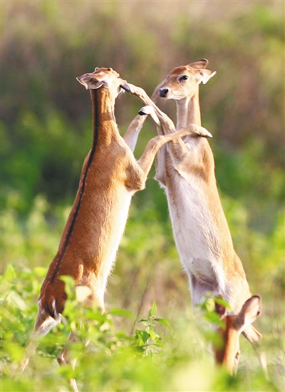 兩只坡鹿在海南大田國家級自然保護區內嬉戲。 海南日報記者 蘇曉杰 攝