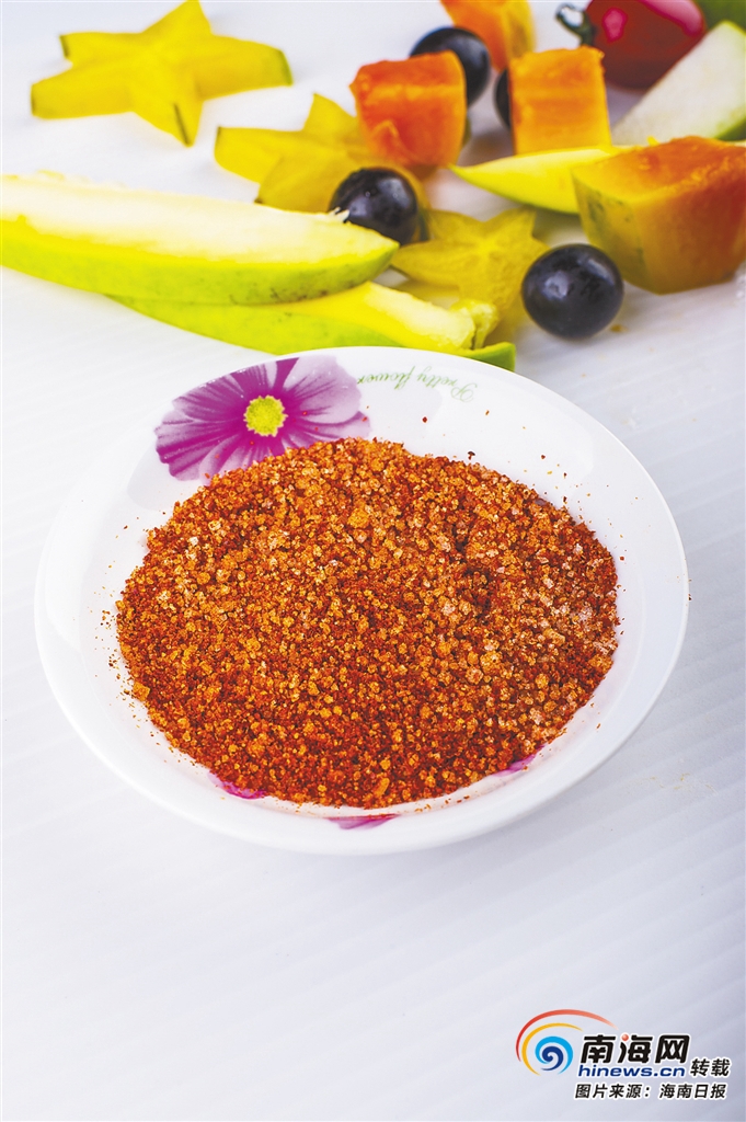 “想更甜,得加辣椒鹽”。在海南,辣椒還有一種特殊的吃法,將新鮮的辣椒剁碎,和鹽佐拌,制成辣椒鹽——這是水果點(diǎn)蘸專用,最常見(jiàn)的點(diǎn)蘸水果是青芒果、番石榴、菠蘿等。
