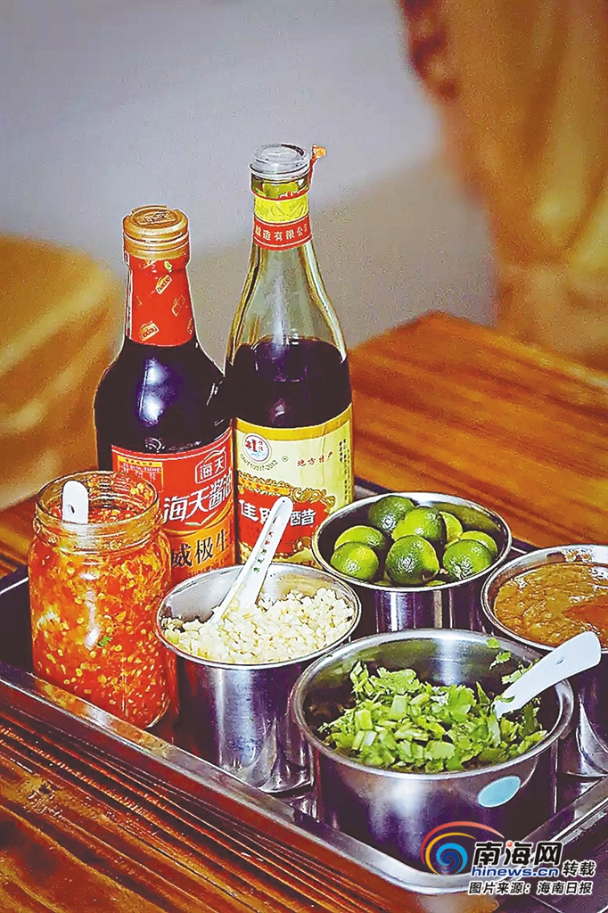 “蒜末、香菜、什錦醬、小桔子、辣椒醬,這些調(diào)料是餐桌上的必備選項(xiàng)。在其他地區(qū),我們很少看到吃一頓飯能有這么多的蘸料。人們根據(jù)自己的喜好、口味去調(diào)配調(diào)料,同一桌的菜肴就能吃出不同的味道。”吳盛群說(shuō),海南人的餐桌上,辣椒最大的作用就是點(diǎn)蘸,雖然扮演的是配角,卻是不可或缺的。