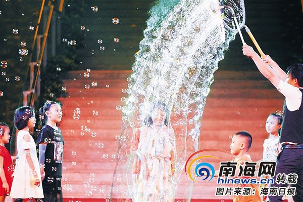 活動(dòng)表演現(xiàn)場(chǎng),泡泡表演藝人在舞臺(tái)上與小朋友們進(jìn)行互動(dòng)。