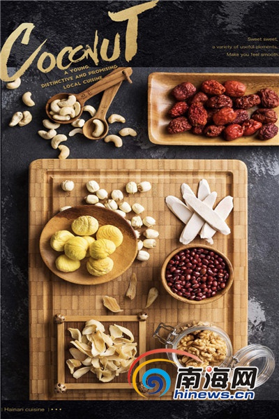 《中國海南菜》裝幀精美,全書銅版紙印刷,封面設計大氣,寓意深遠。一個墨綠色大深碗,碗沿有清晰的鋸齒紋,烘托其間盛放的一枚小青椰,它的頂部有根細細的枝條,沒用刀切,而是直接扯離主桿,保持茬口新鮮......