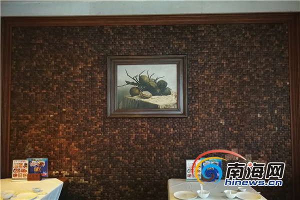 廣州文昌酒店的大堂墻壁裝修別致,這是26年前,文昌手藝人切割椰殼,打磨成一根根細條,粘貼而成。南海網首席記者 康景林 攝