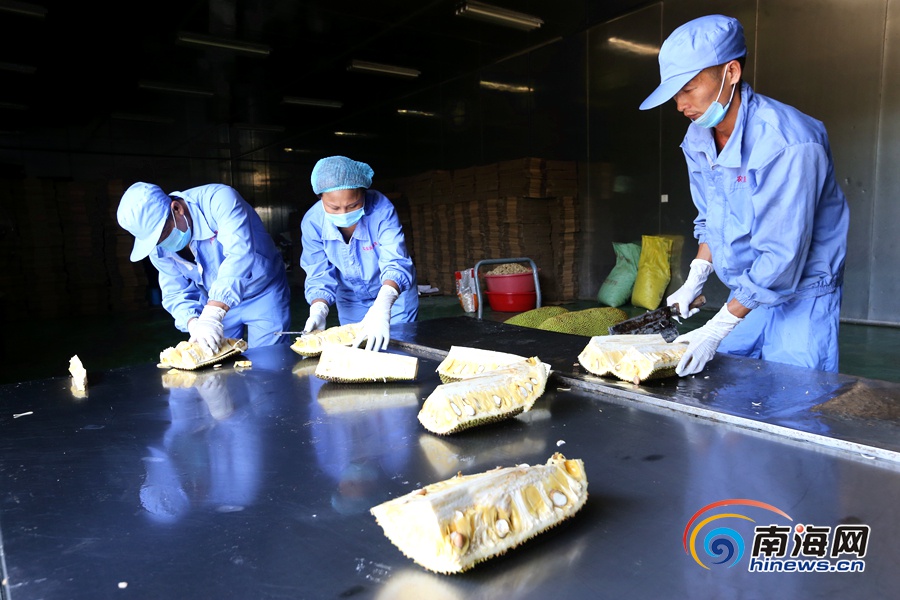 南金農(nóng)場公司菠蘿蜜加工廠的工人正在切割菠蘿蜜。南海網(wǎng)記者陳望 攝