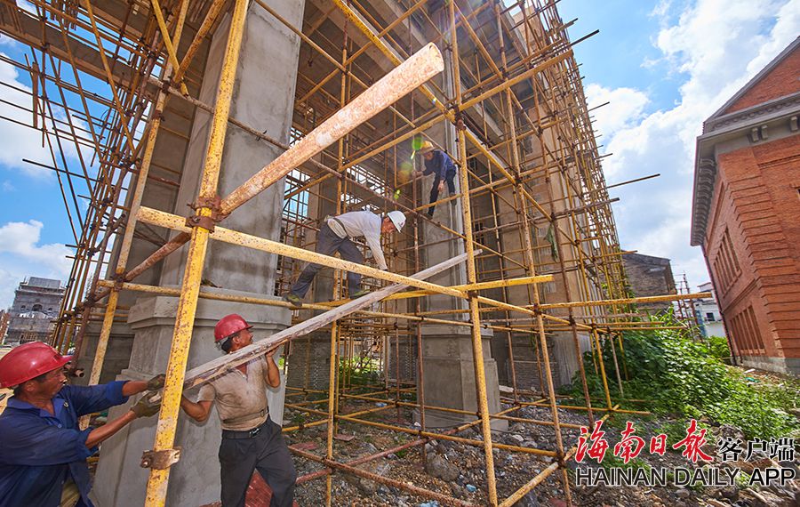 2019年8月28日,海口觀瀾湖電影公社老北京風情街施工現場,工人們正搭設鋼架,以進行隨后的立面裝飾工作。 據了解,電影公社老北京風情街現已完成建筑砌體及抹灰工程,目前主要進行建筑外立面裝飾工作,進度已達70%,并計劃于2020年6月30日前完成整體園林及綠化工程,具備開放展示條件。圖為:電影公社老北京風情街施工現場全貌。(海南日報 見習記者 封爍 攝)
