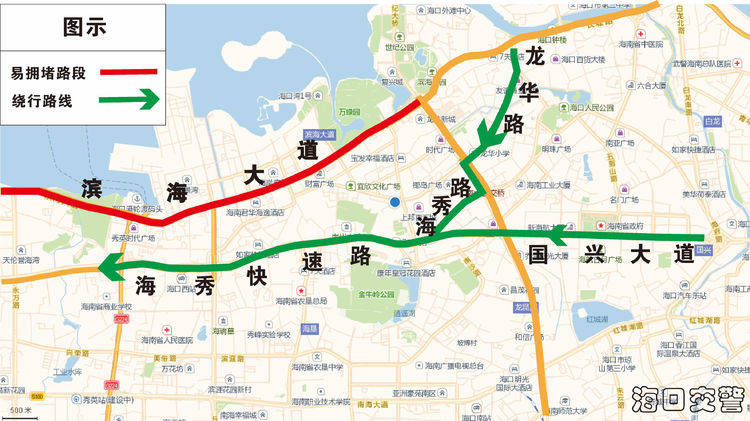 (二)適時管制路段:濱海大道(粵海大道至龍華路);玉蘭路、民生路、世貿北路、紅棉路等萬綠園西側路段;玉沙路、世貿東路、金貿中路、金貿西路、明珠路、國貿大道、金龍路等國貿區域路段;龍昆北路、世紀大橋、濱海立交橋、海甸五西路、人民大道、碧海大道、白沙門公園門前路段等。