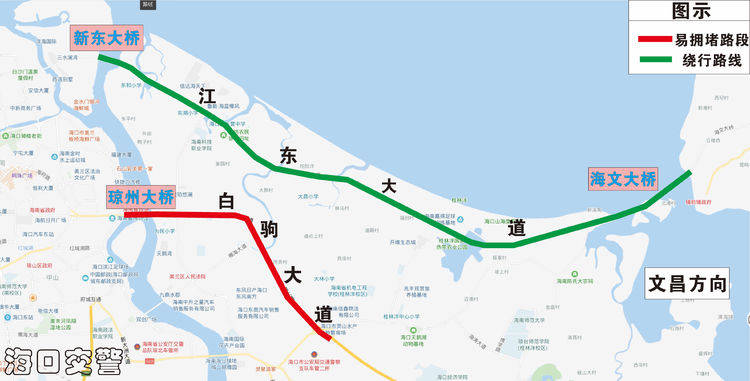 (三)經瓊州大橋、白駒大道前往文昌的車輛集中,建議取道新東大橋、海文大橋往返,減輕國興大道、瓊州大橋交通壓力。