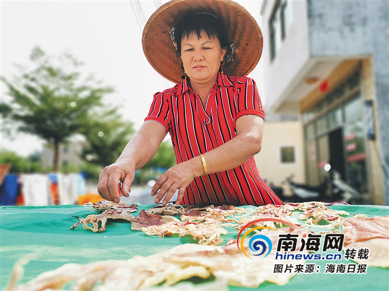 烏場(chǎng)的蔡月琴在曬魷魚(yú)干。海南日?qǐng)?bào)記者 袁宇 攝