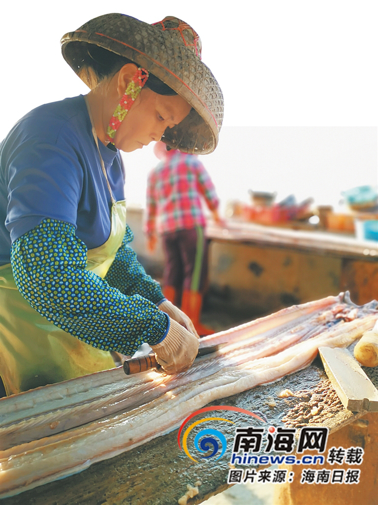 漁民史小麗在處理加工新鮮鰻魚。海南日報記者 于偉慧 攝