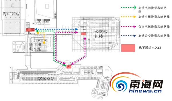 前往海汽客運總站的出租車和從海汽客運總站地下車場入口駛入,在地下車場落客后待客或直接離場,旅客下車后通過地下通道出口到達海汽客運總站地面廣場。
