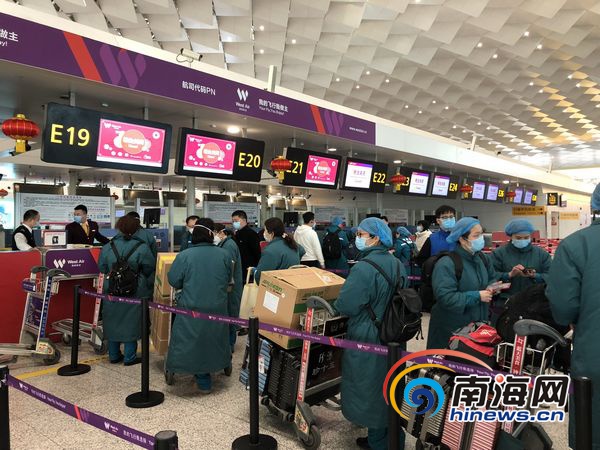 2月15日,西部航空包機護送河南省105名醫護人員馳援武漢,一線空勤人員為醫療隊開通綠色通道辦理值機。海航供圖