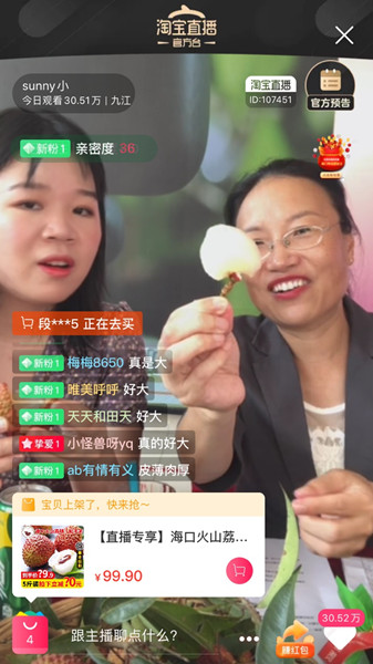 海口農(nóng)業(yè)農(nóng)村局局長(zhǎng)陳芳在淘寶直播推介海口火山荔枝王。淘寶供圖