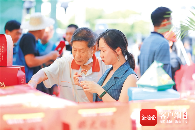 在瓊海展臺前,海口市民鄭嘉禾抱著兒子,品嘗寶島源食品貿易有限公司(以下簡稱寶島源)出品的水晶蝦仁粽。“這個皮是用西米做的,好吃,冰鎮之后肯定口感很棒。”細細品味,鄭嘉禾頻頻點頭:“我從來沒吃過搭配醬油和芥末的粽子,太特別了。”