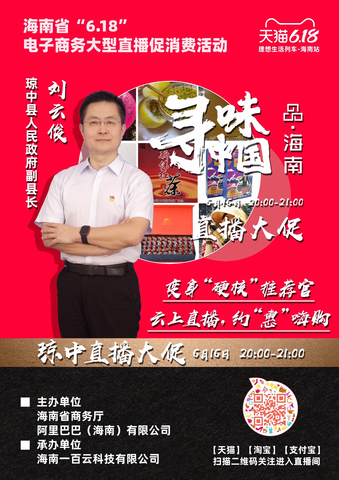 新海南客戶端、南海網、南國都市報6月16日消息(記者 鐘圓圓)“6·18”優惠大促瓊中專場來了!6月16日晚8時—9時,瓊中黎族苗族自治縣副縣長劉云俊將在淘寶直播間推介瓊中的優質農產品。