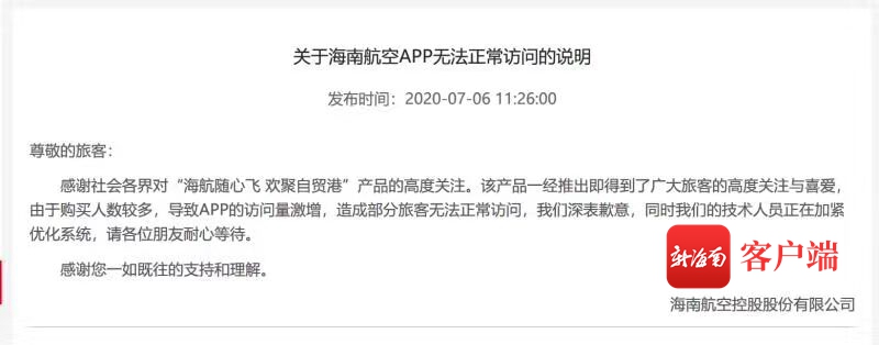 新海南客戶端、南海網、南國都市報7月6日消息(記者 蘇靚 )7月6日上午,海南航空“海航隨心飛,歡聚自貿港”機票產品正式對外發售,由于產品優惠力度大吸引力大,外加海南離島免稅新政的“加持”,11點30分開售時間還未到,此次活動平臺海南航空客戶端就已經被“擠爆”,網友紛紛反映無法正常登錄。海南航空官方微博隨后連發布公告對此問題進行了解釋,并表示首批飛行套票已經售罄,第二批4000張將于7日上午11點30分開售。