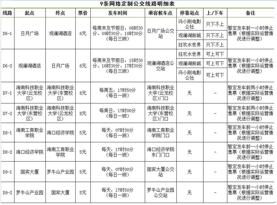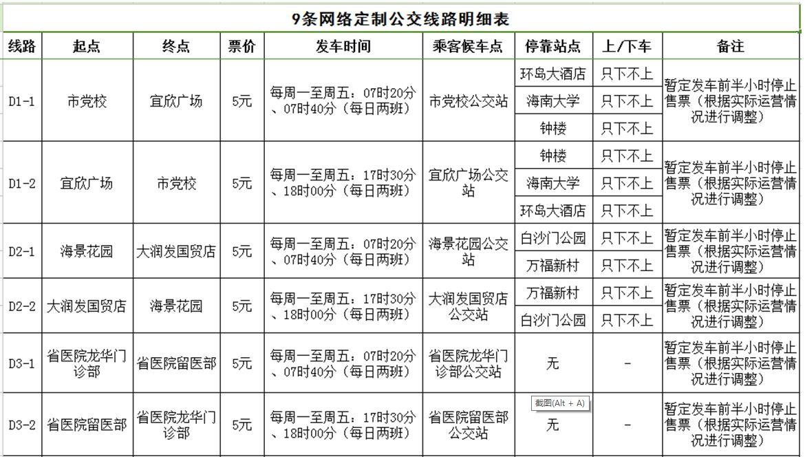 據了解,海口公交集團經過充分調研及需求聚合分析,開通D1(市黨校至宜欣廣場)、D2(海景花園至大潤發國貿店)、D3(省醫院龍華門診部至省醫院留醫部)、D4(友誼陽光城至觀瀾湖酒店)等9條網絡定制公交線路。