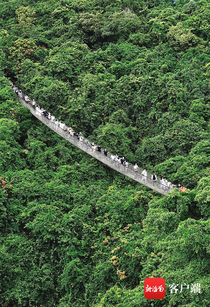在景區著名景點過江龍索橋上,中外游客有條不紊地排著長隊過索橋,體驗熱帶雨林中168米長索橋所帶來的浪漫與刺激。山頂公園的全海景玻璃棧橋、滄海樓、龍雕廣場、天街等景點上人山人海,游人如織,熱鬧非凡。黃金周首日,熱帶天堂森林景區接待游客人數6500多人次。