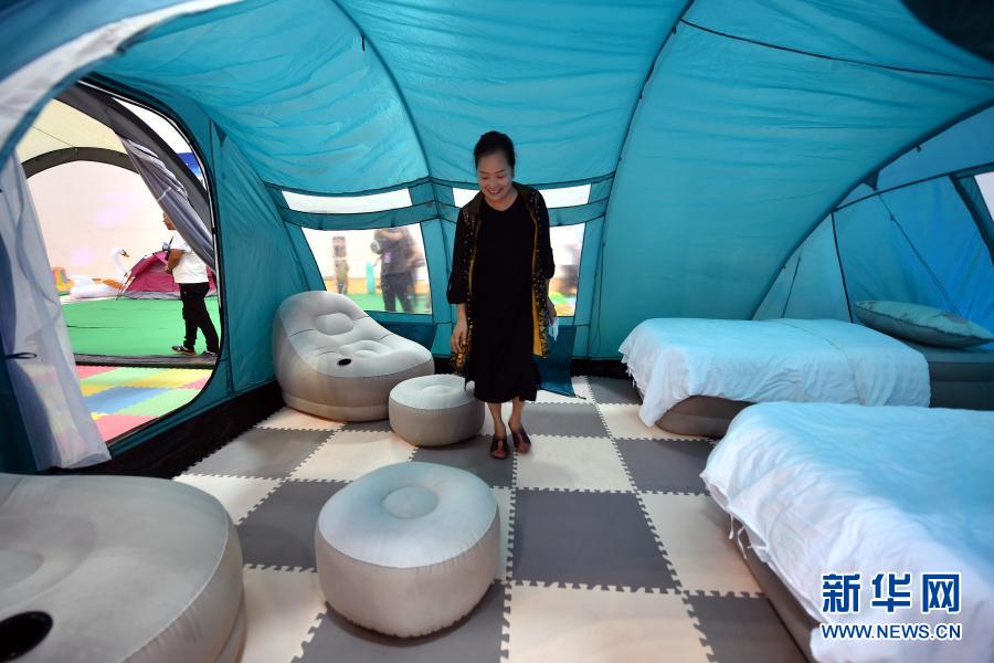 觀眾在參觀展會中展示的一頂露營帳篷。