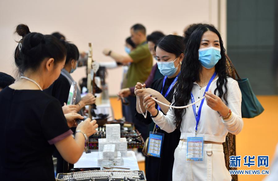 觀眾在海南省展區選購珍珠飾品。