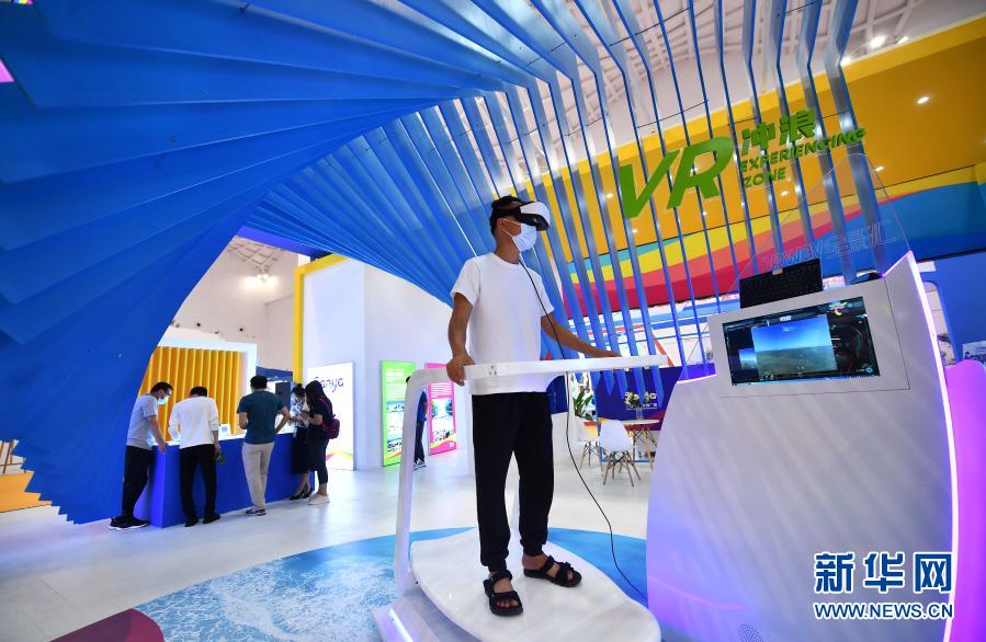 觀眾在海南省三亞市旅游推廣局展區體驗VR沖浪