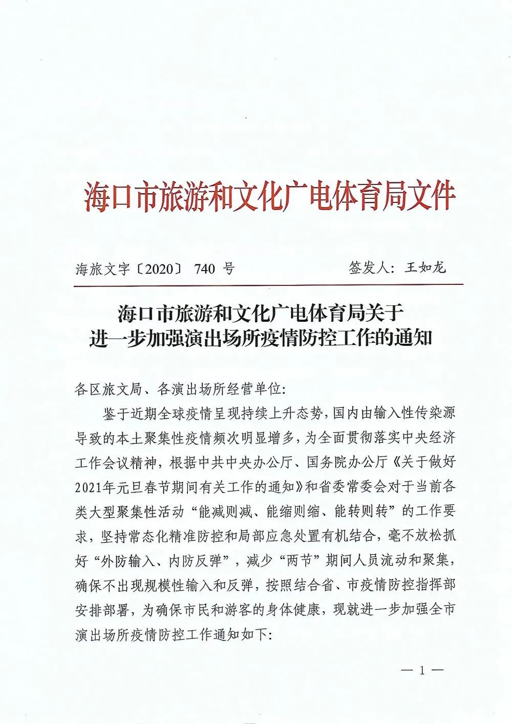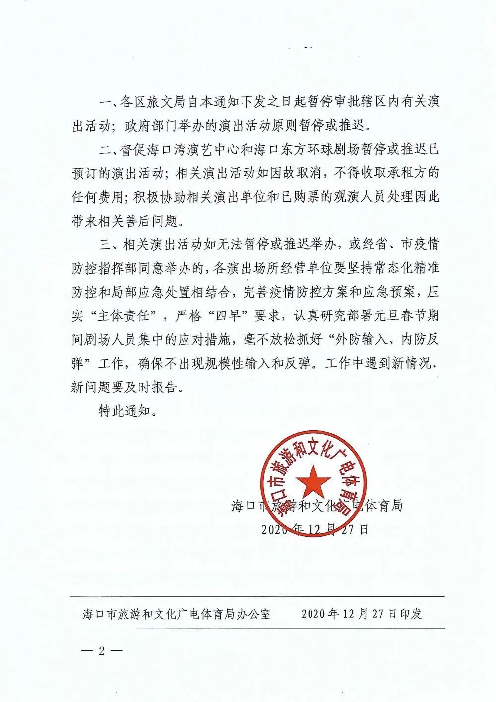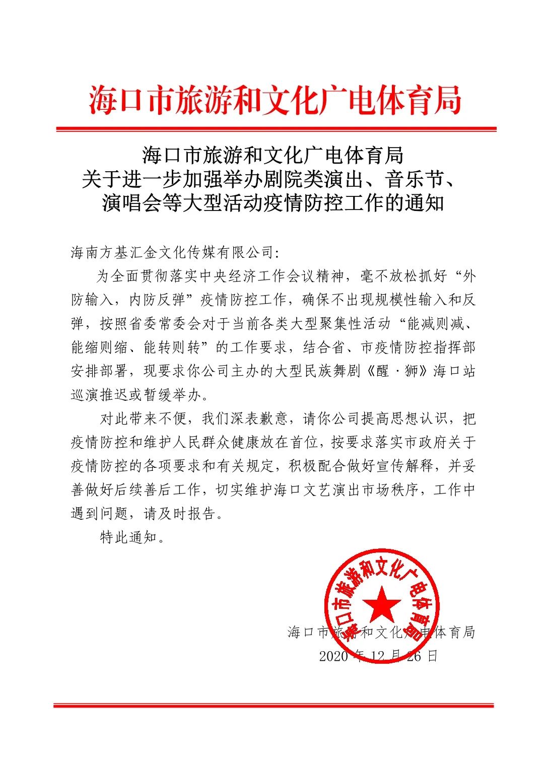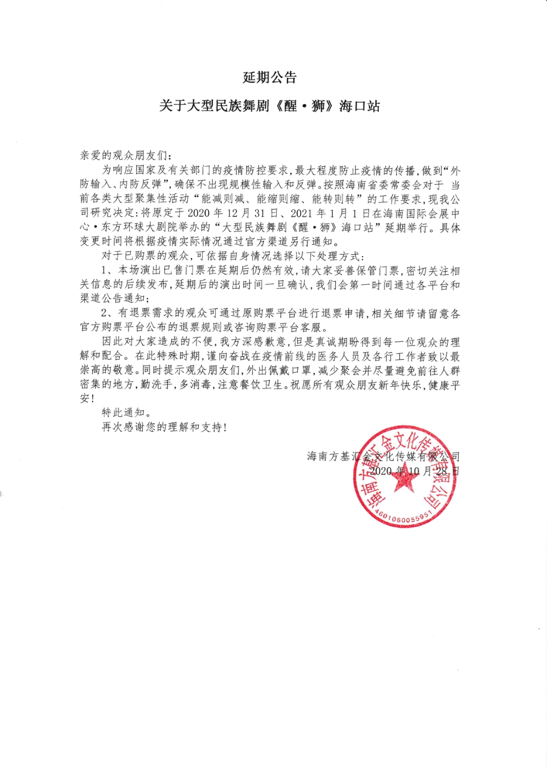 根據(jù)海口市人民政府防疫工作統(tǒng)一要求以及海口市旅游和文化廣電體育局《關于進一步加強演出場所疫情防控工作的通知》文件指示,為更好保障所有觀眾及工作人員生命安全和身體健康,原定于2020年12月31日、2021年1月1日上演的大型民族舞劇《醒·獅》將延期演出,延期的演出我們將為觀眾提供退票服務。延期上演時間將另行通知。