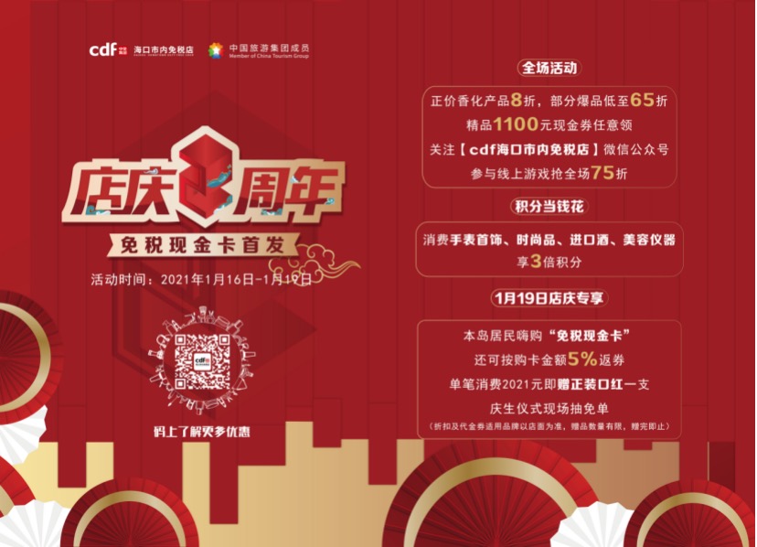 新海南客戶端、南海網(wǎng)、南國(guó)都市報(bào)1月15日消息(記者蘇靚)1月16日—1月19日,中國(guó)旅游集團(tuán)旗下cdf海口市內(nèi)免稅店將舉行2周年店慶活動(dòng)。期間,cdf海口市內(nèi)免稅店推出了全場(chǎng)香化8折、爆款明星香化單品65折,線上搶全場(chǎng)75折等優(yōu)惠,首次推出本島居民專享“免稅現(xiàn)金卡”服務(wù),活動(dòng)當(dāng)日,還將贈(zèng)送“爆款”口紅、9999元紅包免費(fèi)送等優(yōu)惠活動(dòng)。