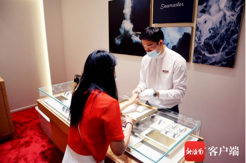 工作人員佩戴口罩、手套服務(wù)旅客。免稅店供圖