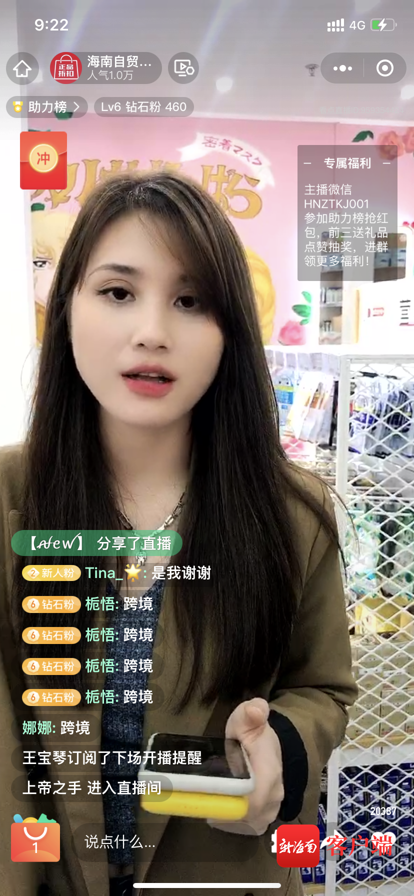 “大家在直播間打上‘年貨節’,點擊關注,就又能參與抽獎,免費獲得資生堂護手霜?!?7日晚7時30分,海南跨境“美麗年貨”聯合直播正式開播,主播“七七”向網友拋出福利,引來大批網友涌入直播間。
