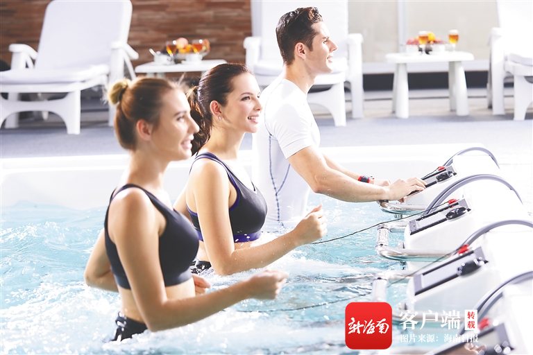 康養(yǎng)旅客正在體驗(yàn)水下跑步機(jī)。