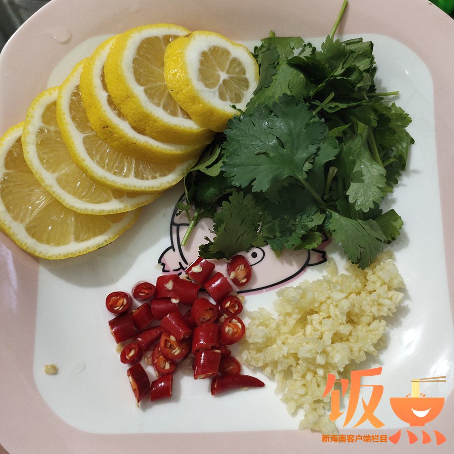 3、雞爪浸泡的過程中,準備一下配料:切蒜粒、小米椒切小段、香菜切小段、檸檬切片,把籽挑出來