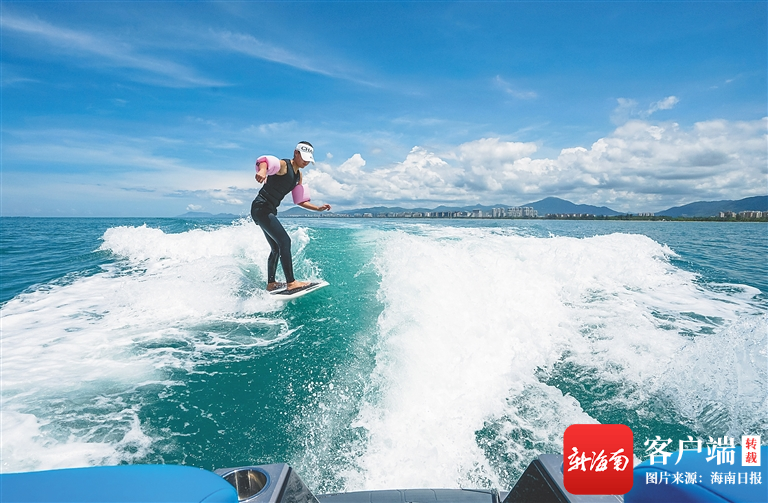 一艘艘五顏六色的造浪快艇快速劃過海面,在造浪快艇的船尾,借助拉繩在造浪上快速滑行,掌握技巧后,拋開繩子,做出各種酷炫的動作……2021年以來,三亞尾波沖浪爆紅網(wǎng)絡(luò),各路明星紛紛前來打卡,有力帶動這一水上運動項目人氣。除了游艇出海之外,尾波沖浪為三亞旅游業(yè)再添一道“新名菜”。