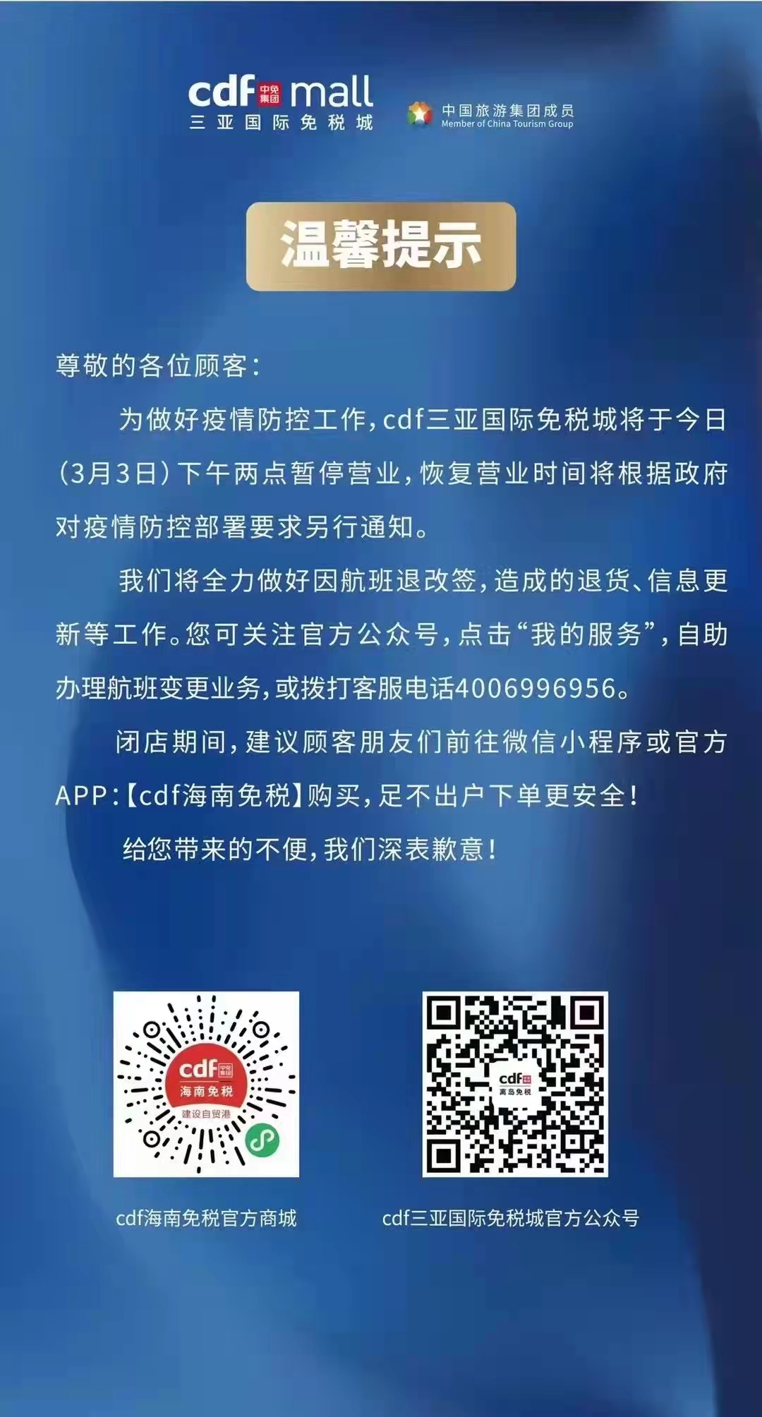 新海南客戶端、南海網、南國都市報3月3日消息(記者沙曉峰)3月3日,記者從三亞國際免稅城獲悉,接三亞市疫情防控及有關部門通知,因疫情防控需要,三亞國際免稅城3月3日14:00起暫停營業,恢復營業時間另行通知