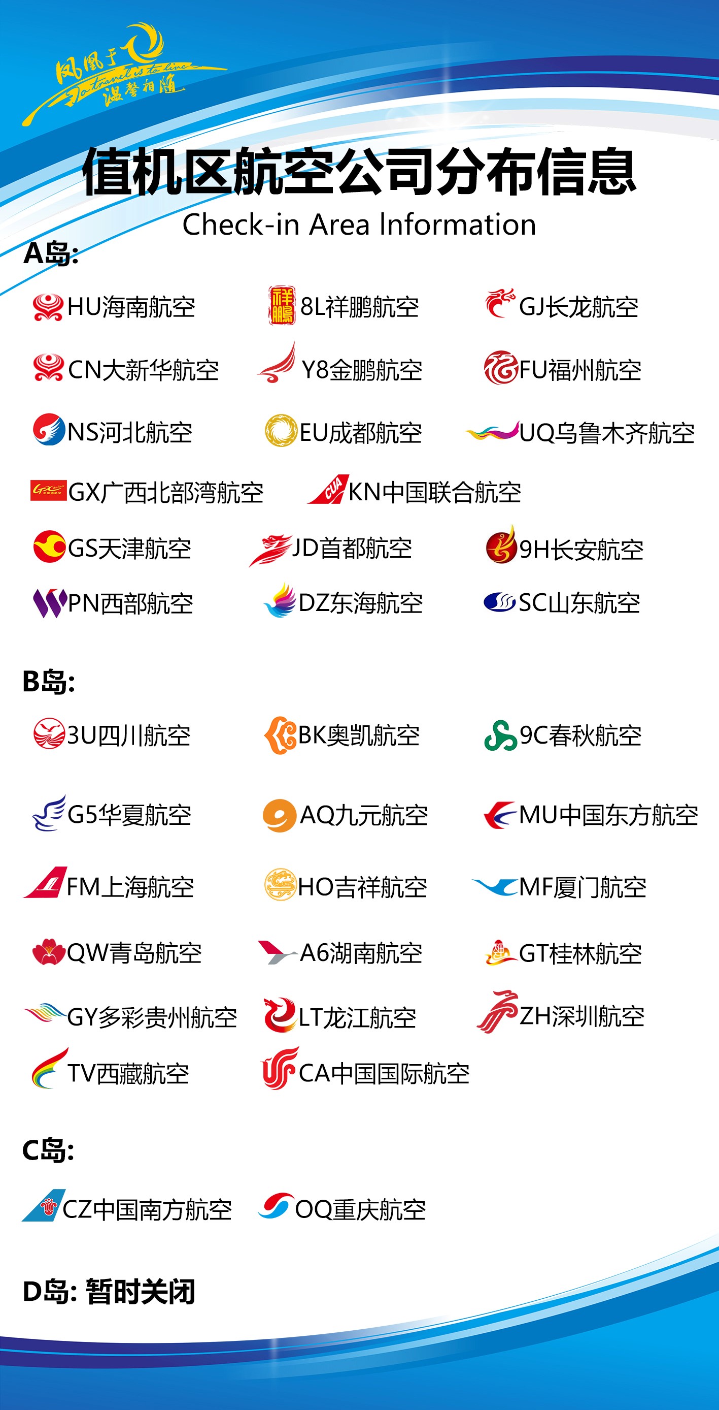 值機A島(A1-A16)辦理航空公司:海南航空(HU)、祥鵬航空(8L)、廣西北部灣航空(GX)、大新華航空(CN)、金鵬航空(Y8)、福州航空(FU)、河北航空(NS)、成都航空(EU)、中國聯(lián)合航空(KN)、長龍航空(GJ)、烏魯木齊航空(UQ)、首都航空(JD)、天津航空(GS)、山東航空(SC)、長安航空(9H)、西部航空(PN)、東海航空(DZ);