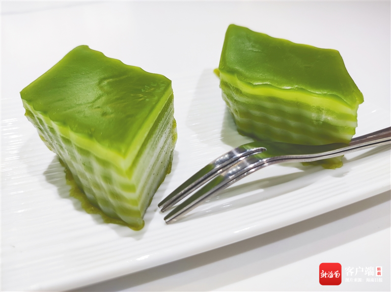 走進海南的尋常巷陌,常常會在甜品店發現一種綠色的糕點,當你詢問店家時,他們會告訴你那是“斑斕糕”。斑斕糕是加入斑斕進行調味后制成的點心,它以翠色逼人的綠作為視覺表征,入口往往帶有清新香甜的植物芳香。