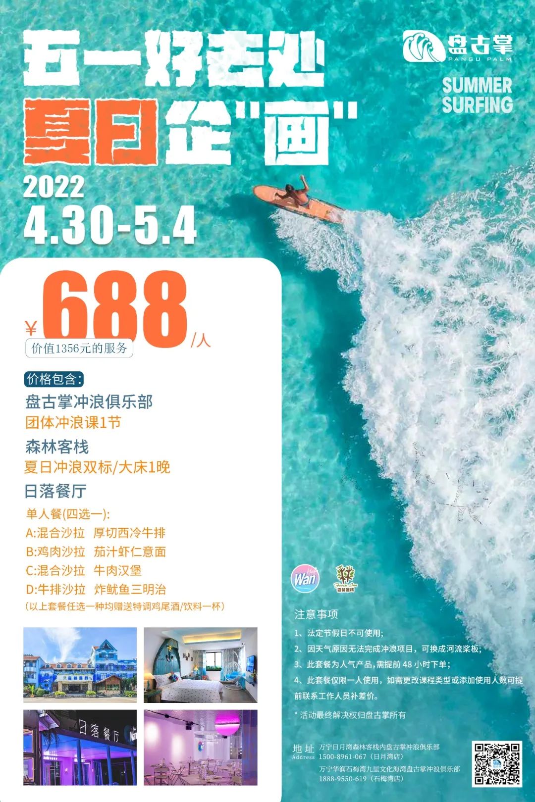 在日月灣,森林客棧聯(lián)手盤(pán)古掌沖浪俱樂(lè)部推出“五一好去處 夏日企‘畫(huà)’”活動(dòng),參與的游客既可以享受活力沖浪,又能在日落餐廳品嘗豐富的美食,享受愜意時(shí)光;萬(wàn)寧龍之舟海洋民宿的“住民宿,帶您入鄉(xiāng)游”五一活動(dòng),包含后海踏浪、海釣、趕海抓蟹 、自助燒烤、卡拉OK、民宿等。