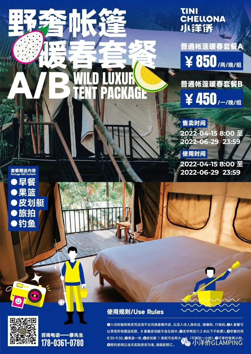 融入自然安營(yíng)扎寨,看云卷云舒,暢享悠然生活。這個(gè)五一,小洋僑旅游區(qū)精彩推出850元/兩晚“野奢帳篷暖春套餐”、988元/晚“追夢(mèng)帳篷大床套房套餐”、1788元/晚“家庭親子雙層帳篷套餐”等超值優(yōu)惠產(chǎn)品,以及劇本殺游戲“四疊半人生推理館”等互動(dòng)游戲,讓游客朋友們?cè)谙硎芤吧萋稜I(yíng)生活的同時(shí),還能與家人、朋友體驗(yàn)槳板、皮劃艇、釣魚(yú)等豐富活動(dòng),享受萬(wàn)寧愜意的“慢生活”。