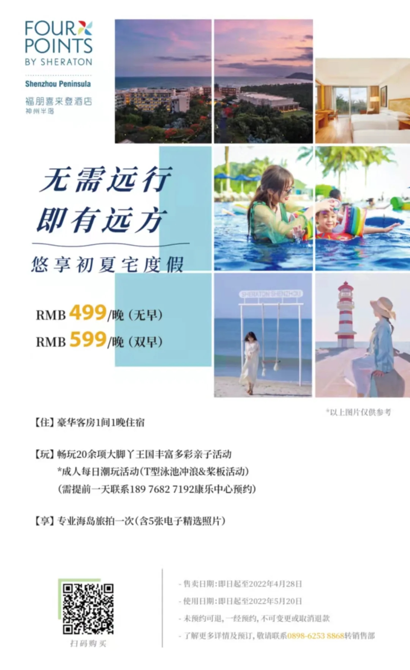 假日,石梅灣威斯汀度假酒店精心打造999元/晚“汀·海|復(fù)蘇之旅”,帶領(lǐng)住客一站式體驗(yàn)假日生活;石梅灣艾美度假酒店精心推出668元起的“加井島浪漫海景晚宴”、398元/套“茶. 馥 海景下午茶”、888元/套“瓊味江南中式套餐”等風(fēng)格不同、各具特色的餐飲優(yōu)惠套餐;海南康樂(lè)園海航度假酒店推出418元購(gòu)“椰泉?jiǎng)e墅豪華房”1間1晚或2間1晚的超值優(yōu)惠;神州半島福朋喜來(lái)登酒店結(jié)合現(xiàn)有的沖浪、精致露營(yíng)地、日落酒吧等業(yè)態(tài),推出“無(wú)需遠(yuǎn)方 即有遠(yuǎn)方”“泳池派對(duì)”“五一公益環(huán)保瑜伽”等潮流活動(dòng),綻放初夏無(wú)限精彩。