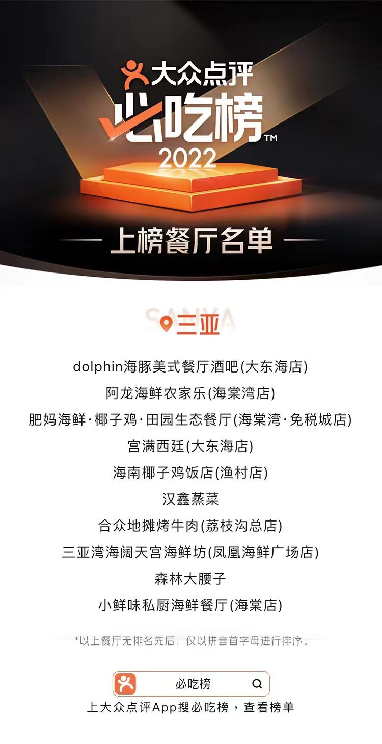 新海南客戶端、南海網、南國都市報6月22日消息(記者 任桐 實習生 姚詩瑞)6月22日,大眾點評正式發布2022年“必吃榜”,全國57城1482家優質餐廳脫穎而出。其中,海南共有25家餐廳上榜,海口15家,三亞10家。據悉,大眾點評“必吃榜”已經是第六年發布。