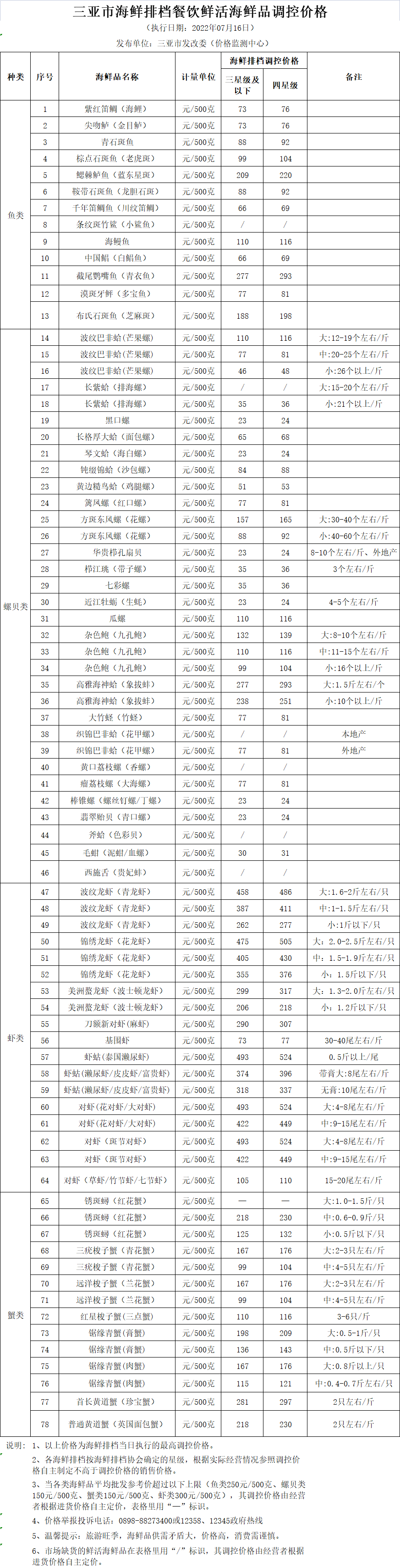 三亞市海鮮排檔餐飲鮮活海鮮品調控價格(2022.07.16)