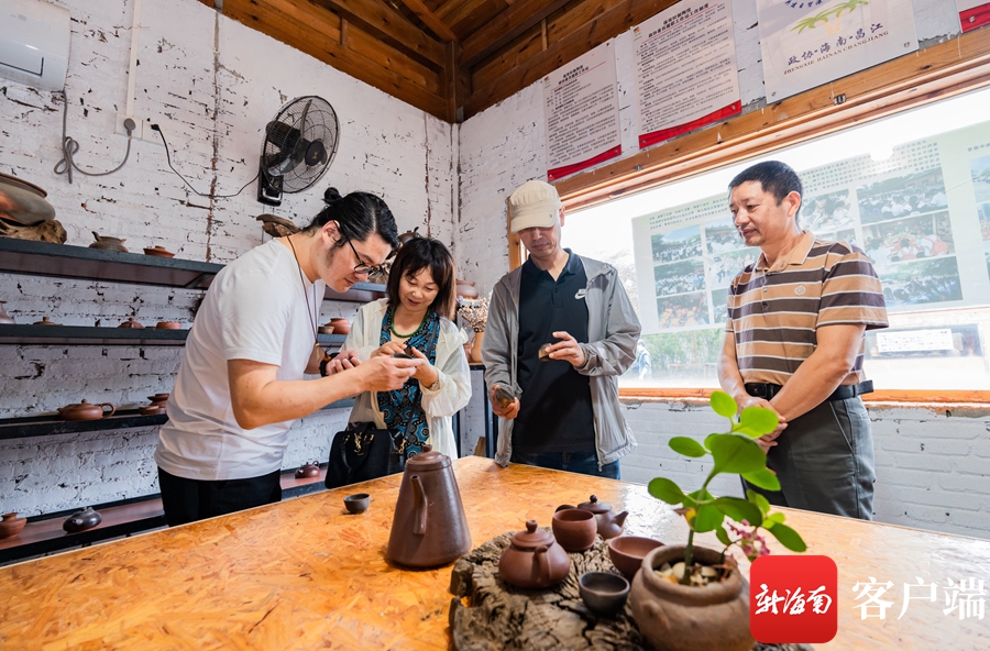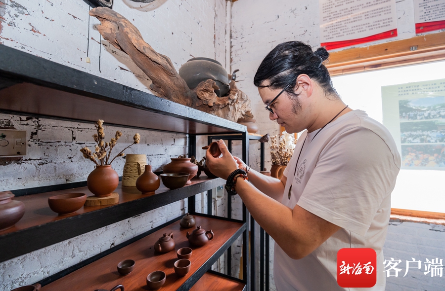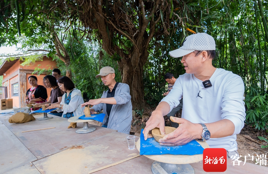 文化名家們在傳習所內嘗試制作黎陶。分茶器、酒杯、筆筒、碗盤……大家發(fā)揮自己的想象力,揉捏手中的當?shù)馗邘X土,玩起了泥巴,不亦樂乎。