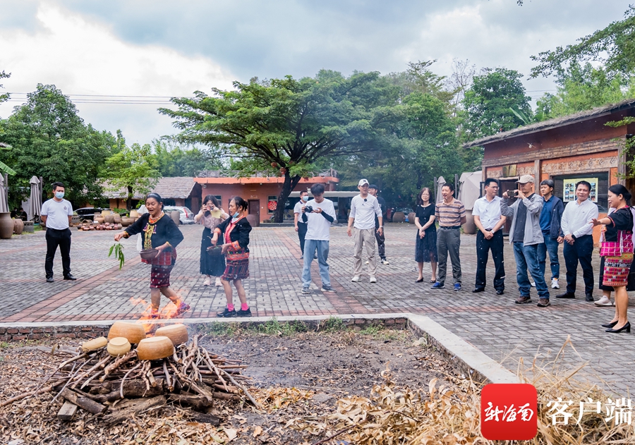 現(xiàn)場還舉辦了一場露天燒陶禱告儀式。燒制場里的篝火燃起后,制陶老人圍著火堆慢慢走著,保佑著燒制的順利。文化名家們沉浸在禱告聲中,感悟黎族非遺民俗文化的魅力。