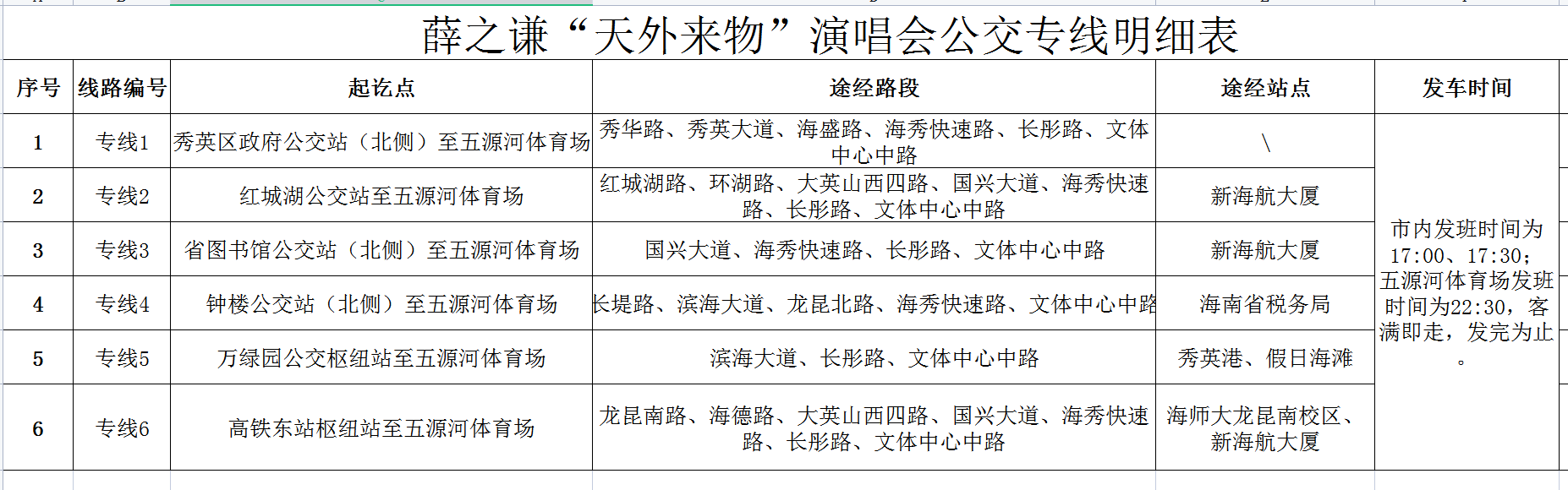 專線往程采用定點發班模式,發車時間為17:00、17:30。演唱會結束后,為了避免出現觀演市民滯留,??诠患瘓F在演唱會結束后在五源河體育館B區出入口為臨時公交專線上客點, 客滿即走,發完為止。