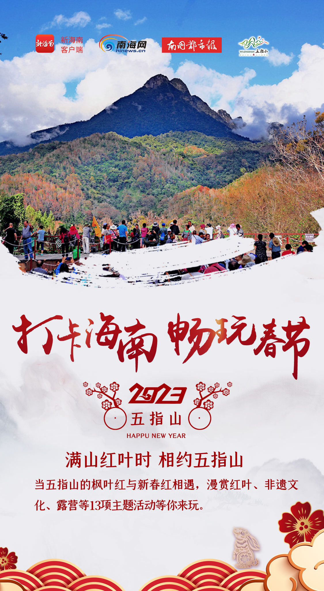 除了山城好物年貨節(jié)外,還有2023年五指山市兔年村晚“啟航新征程 幸福中國年”活動、“文明實踐送春風,黎家春節(jié)醉人心”2023年“我在毛納過大年”文明實踐活動、各鄉(xiāng)鎮(zhèn)過大年(民俗活動)、毛納露營節(jié)、歡樂鬧元宵游園會、早春茶開采節(jié)、徒步健走、樊登讀書-雨林下的演講、“漫賞紅葉”五指山紅葉旅拍節(jié)、五指山首屆“1867”鄉(xiāng)村籃球聯(lián)賽、五指山“老州府”杯全省足球邀請賽、雨林天路自行車挑戰(zhàn)賽等共13項精彩主題活動。