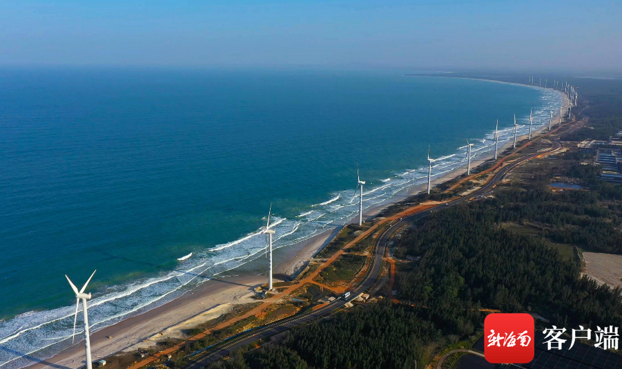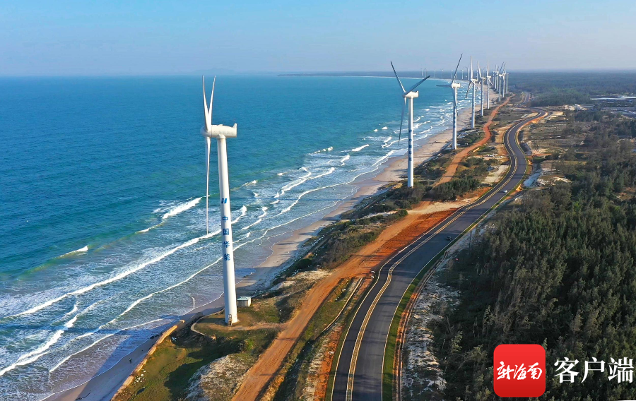 木蘭灣旁綿延幾公里的風力發電機和旅游公路形成一道靚麗風景線。記者汪承賢攝