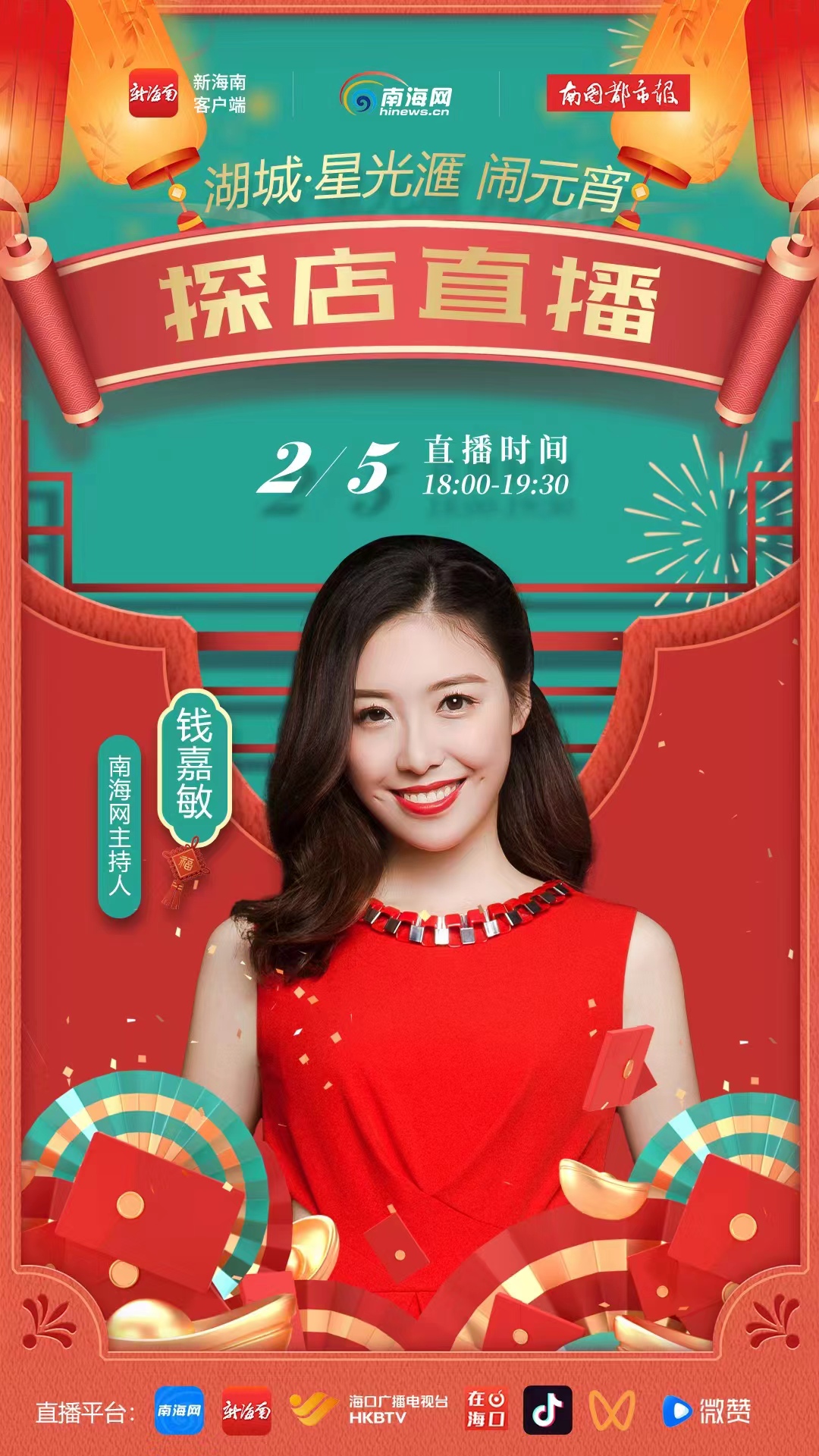 海口瓊山區5日18時開啟探店直播,南海網主持人錢嘉敏帶您逛海口湖城星光匯“鬧元宵”。
