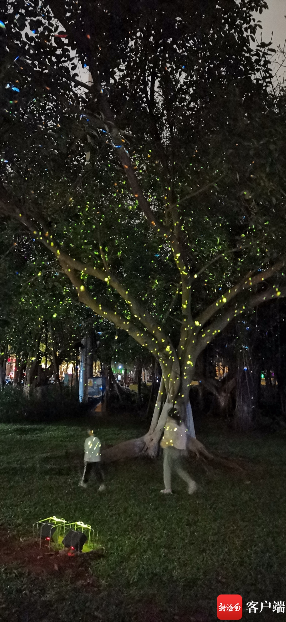 除了螢火蟲燈,記者看到旁邊不遠(yuǎn)處的好幾棵大榕樹上吊掛著許多如水滴一樣形狀的燈,五顏六色,炫彩奪目。榕樹下方的小廣場上則是豎著幾根如蒲公英形狀的球形燈具,發(fā)著白色的光芒。當(dāng)晚八點(diǎn),從南門和旁邊空地進(jìn)入園區(qū)的市民絡(luò)繹不絕,乃至于摩肩接踵。人們紛紛被燈光吸引,駐足觀看。