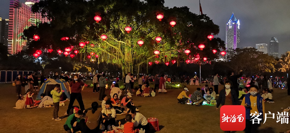 五彩斑斕,人潮涌動,是元宵夜的萬綠園給人的第一印象。當(dāng)你走進(jìn)萬綠園騰飛廣場附近那片寬廣的綠地,站在人潮中看向?yàn)I海大道方向,你會發(fā)現(xiàn)這樣的景象:眼前,許許多多的人們或走動或三五成群席地而坐,又或者搭了個露營小帳篷聊天吃零食喝飲料,一派熱鬧;遠(yuǎn)一點(diǎn),掛滿了紅彤彤燈籠的大樹隨風(fēng)小幅波動,添了一種歡喜的氣氛;再遠(yuǎn)一些,就是成群的高樓建筑正在上演著賞心悅目的燈光表演。一切似乎都在動起來,熱鬧似乎是停不下的流動的波浪。